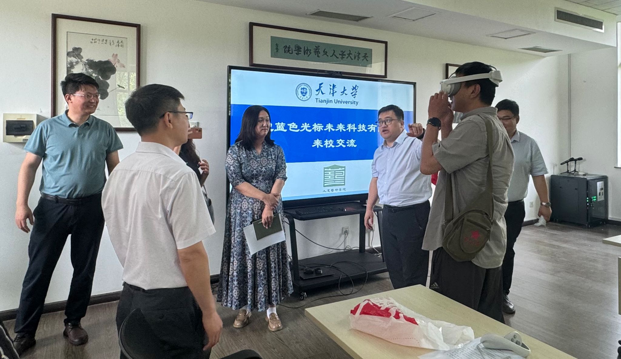 各系所中心教师代表从通识课教育体系、沉浸式虚拟课堂体验、校史讲述智能场景实现等方面与企业展开热烈讨论,并佩戴VR眼镜体验了企业开发的虚拟空间场景。教师们表示,此次交流会全方位了解了“人工智能+教育”新模式,通过实例看到了人工智能在学科建设和人才培养中落地应用的前景。希望校企双方继续深化交流,尽快达成实际落地的合作项目。