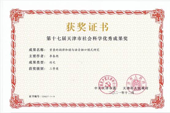 简介:论文《重叠的韵律和谐与语音拗口模式研究》发现语音重叠可以形成韵律和谐与语音拗口这两种截然不同的语音效果,并从重叠成分是否规律性呈现、相同成分的重叠量度以及搭配成分的语音差异性三个方面进行了阐释。论文2020年7月发表于《复旦学报》,2021年第2期被中国社会科学文摘全文转载,2021年获天津市第十七届社科成果三等奖。